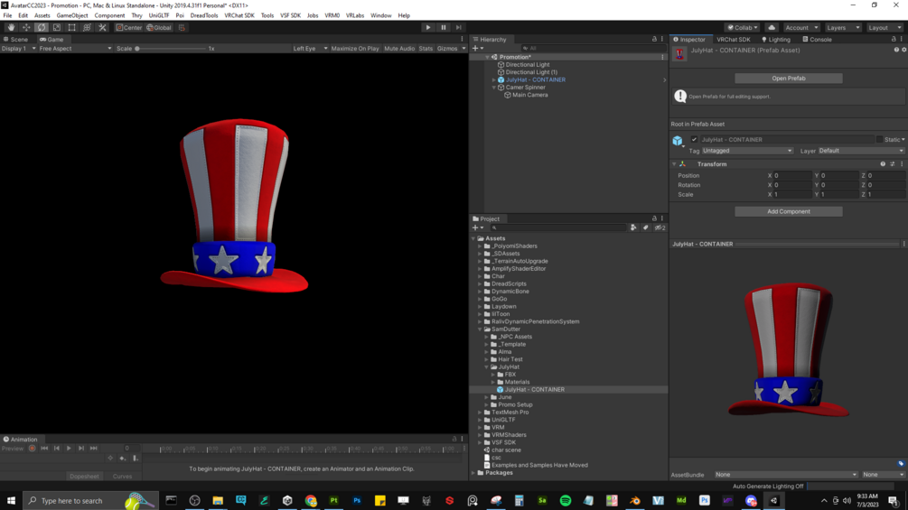 - Drag the JulyHat Container prefab into the scene with your avatar